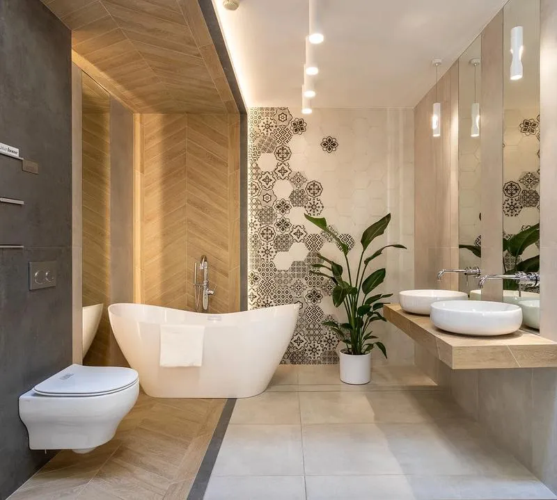 - Wielowarstwowe oświetlenie, z zastosowaniem różnych źródeł światła, poprawia funkcjonalność i estetykę łazienki.